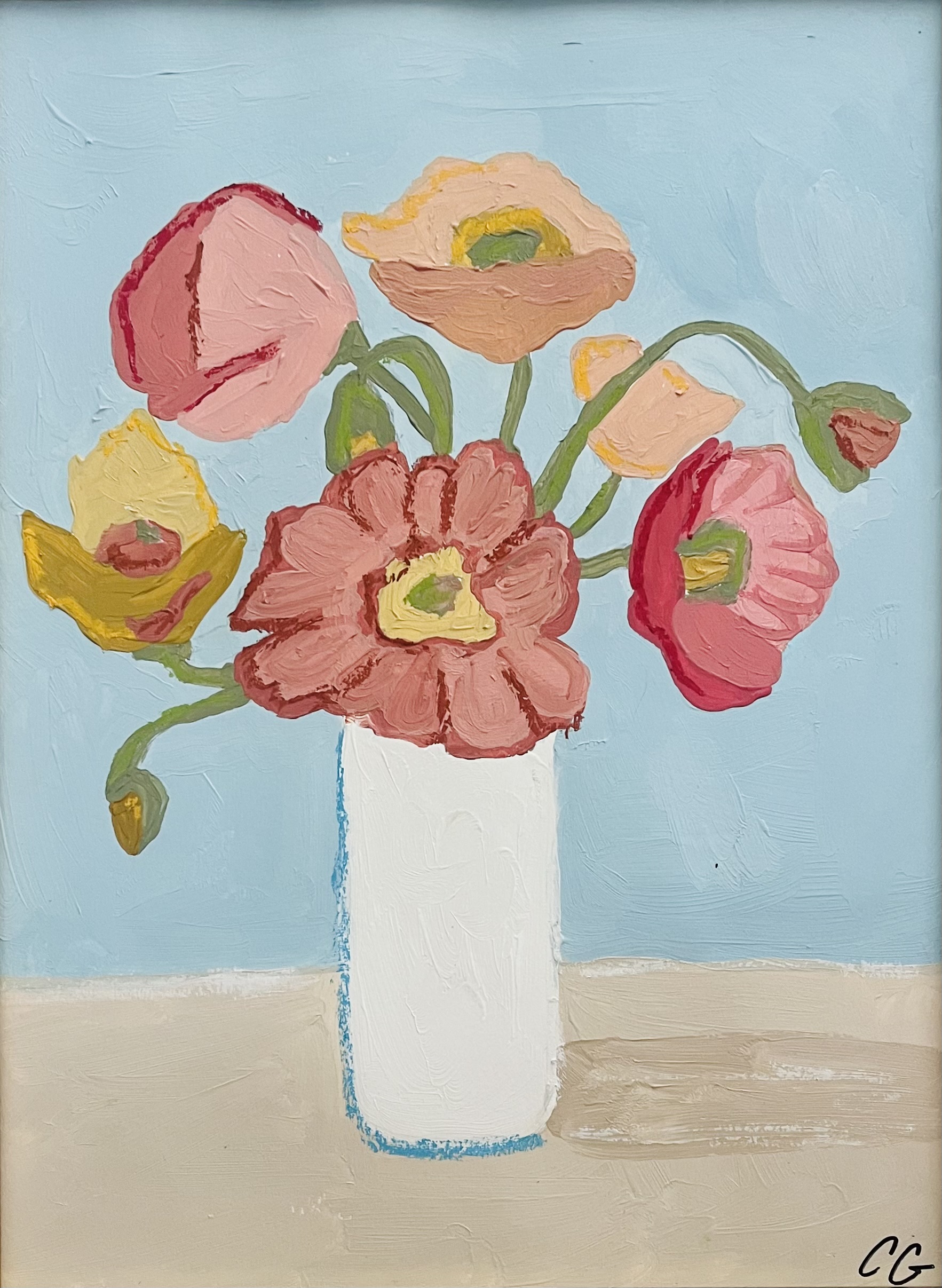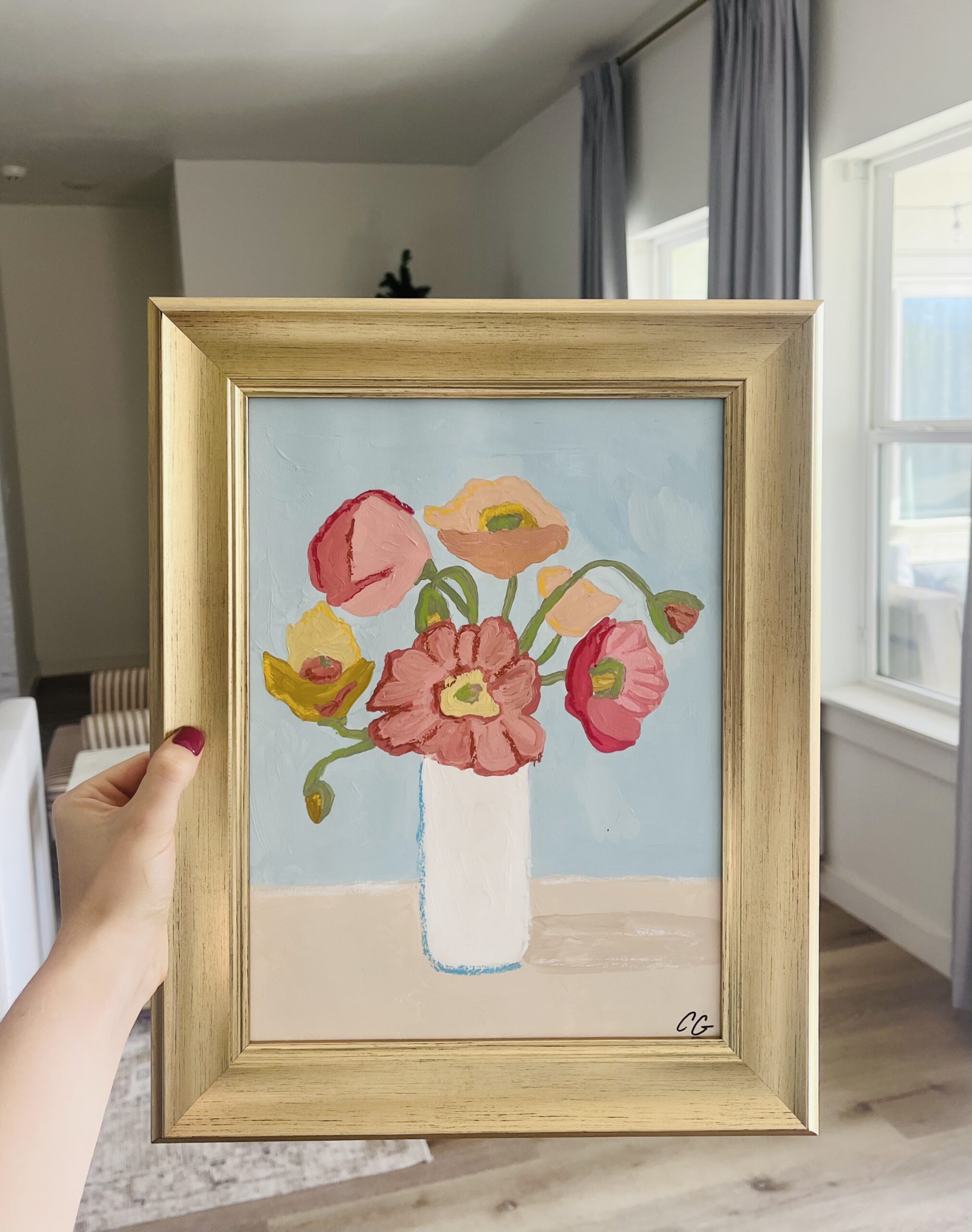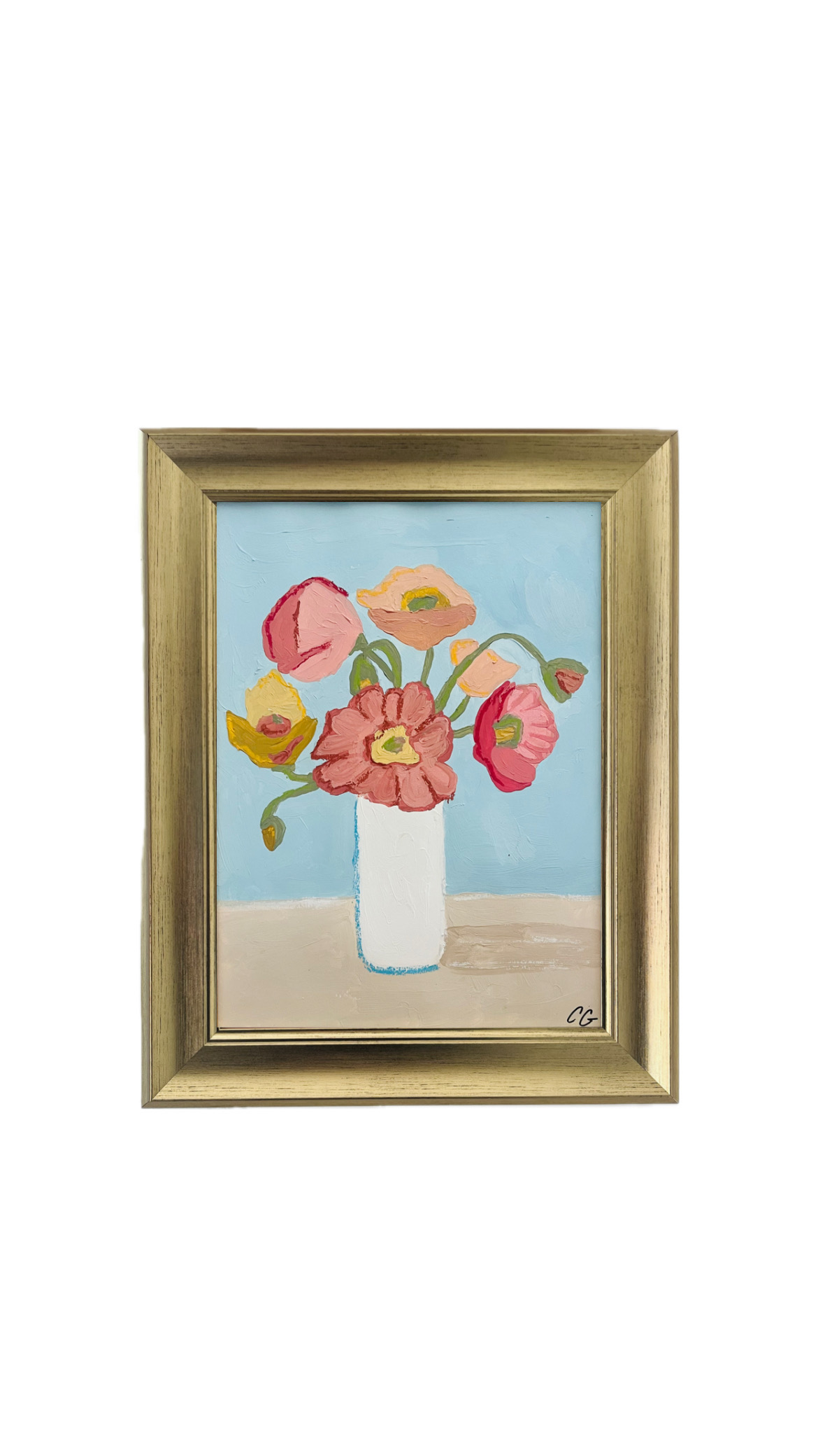 Original, vibrant and whimsical peony bouquet painting. Acrylic and oil painting on fine art paper. 9 in x 12 inch art piece. Frame included.