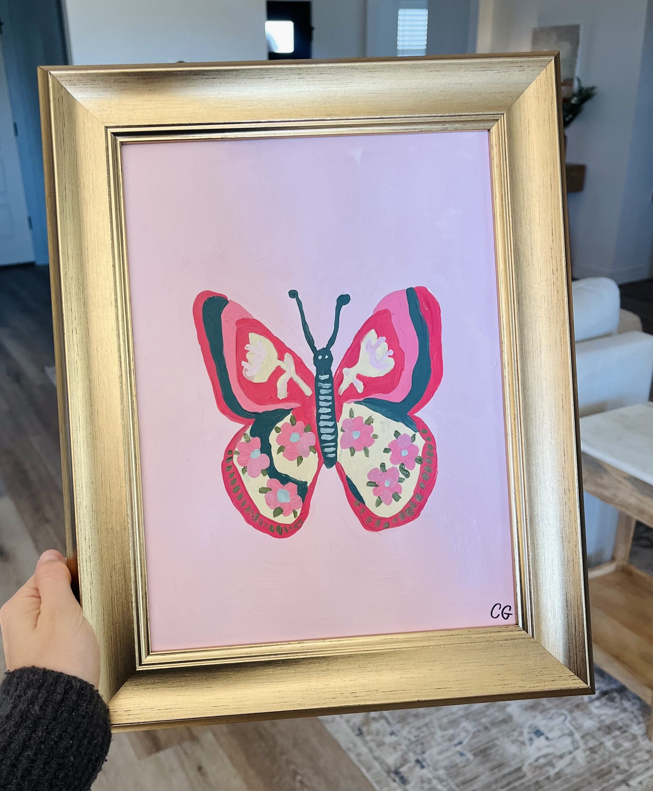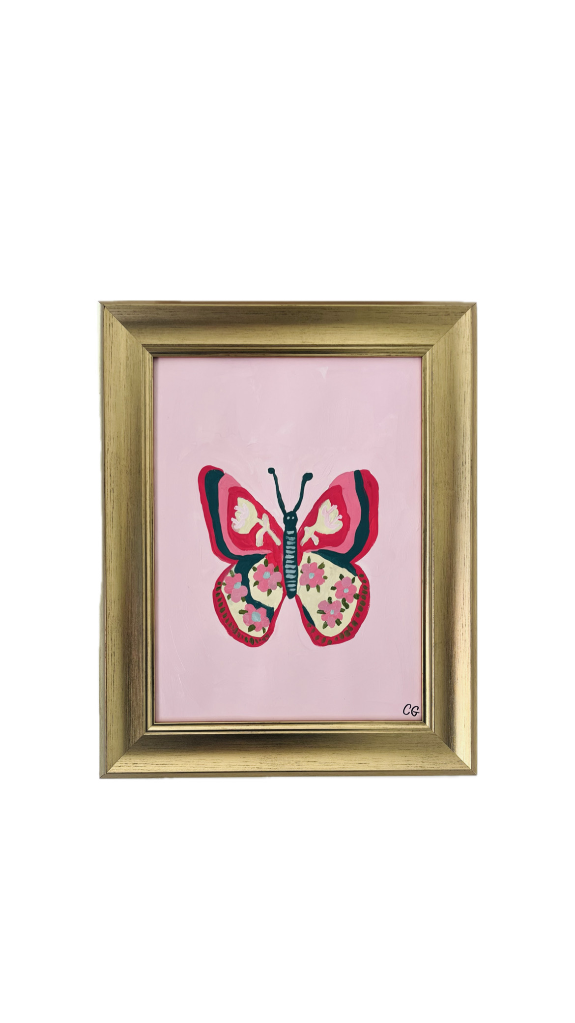 Original, vibrant and whimsical butterfly painting. 9 in x 12 inch art piece. Frame included.