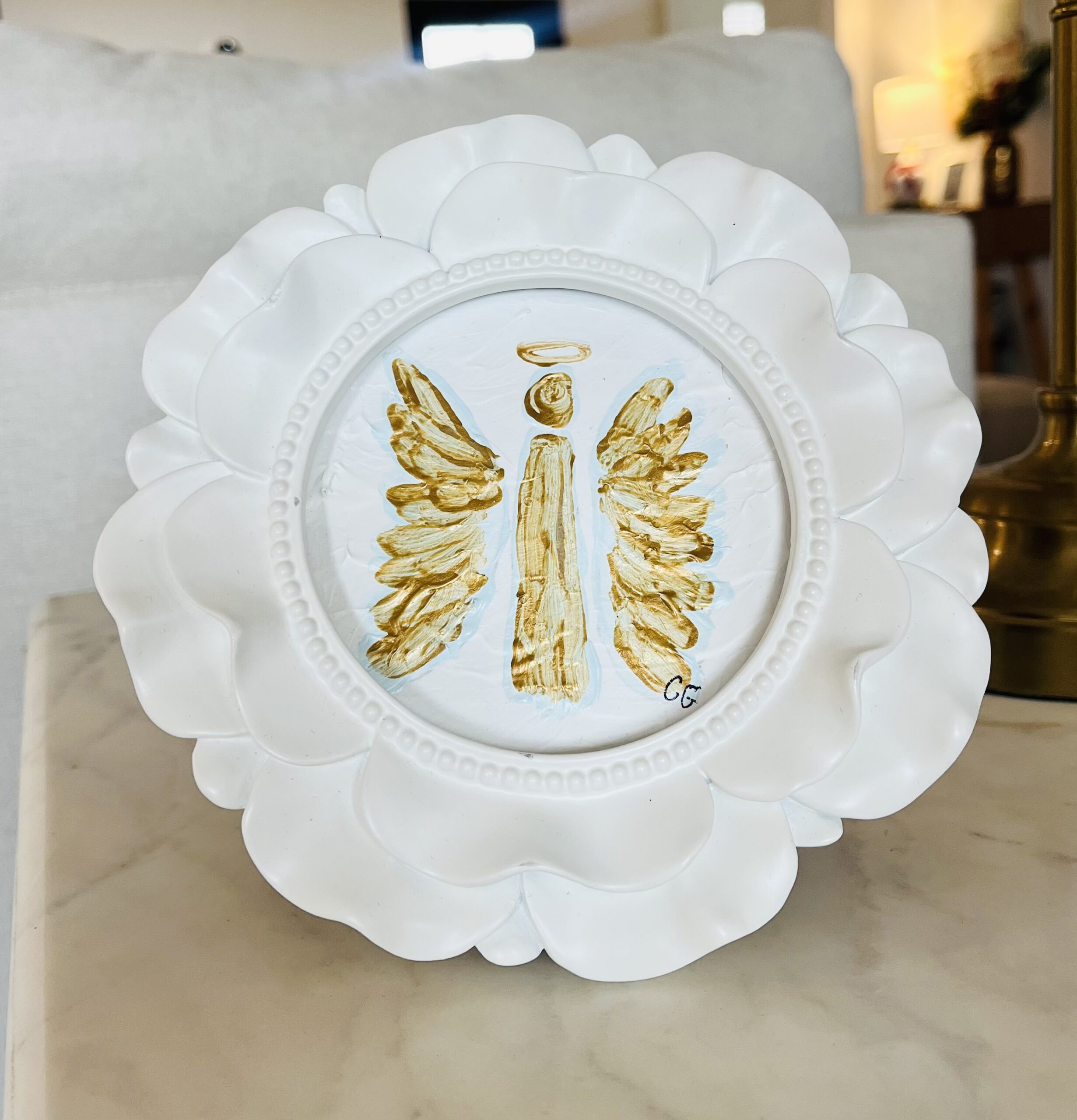 Original textured, angel painting. Frame is 6 inches in diamets. Signed.