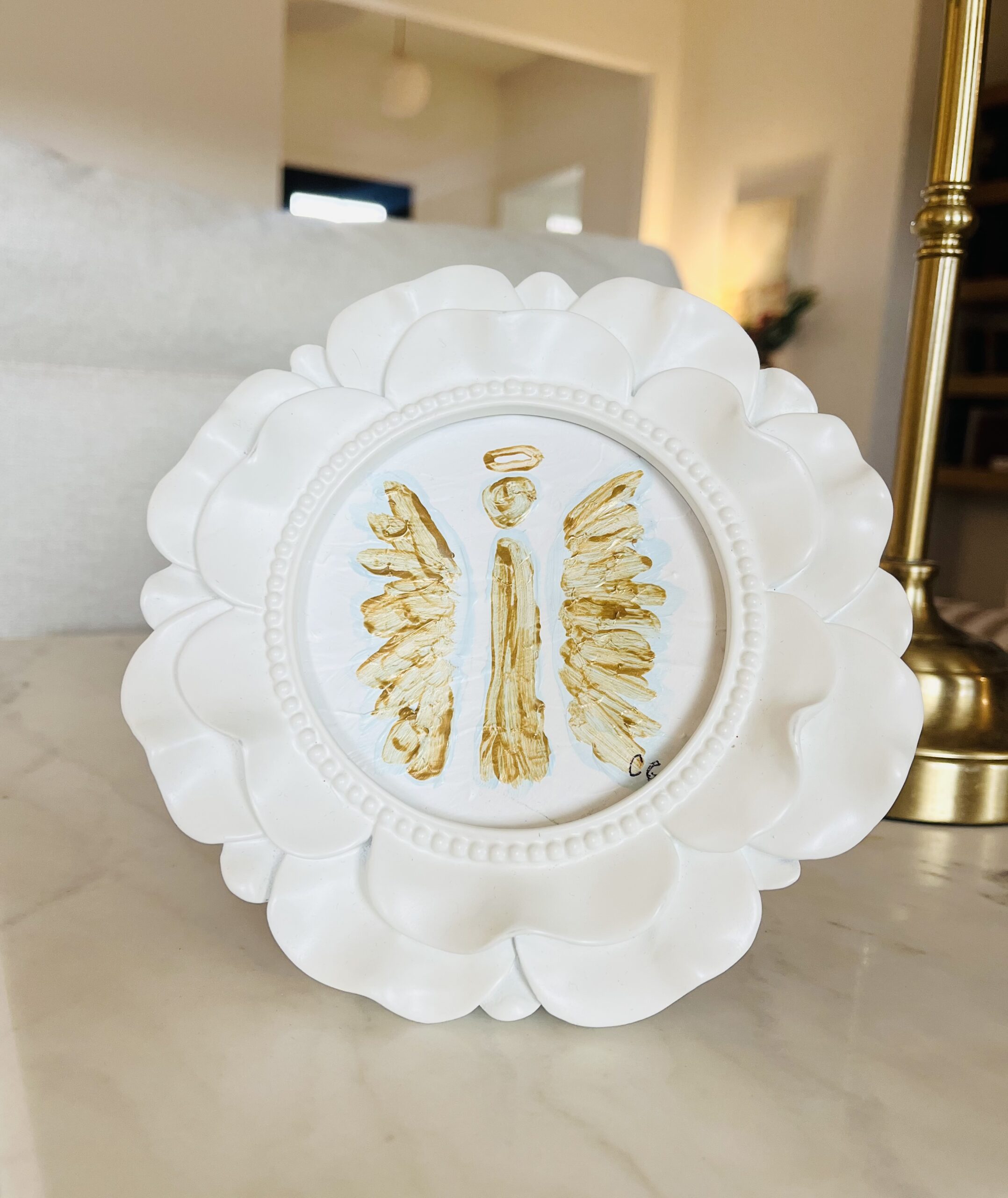 Original textured, angel painting. Frame is 6 inches in diamets. Signed.